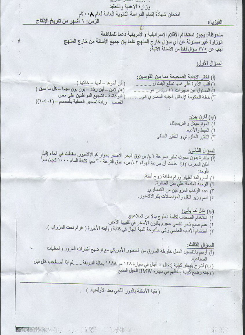 إستجابة لدعوة الإبن الحبيب محمد ArabianPDF تداخلت بهذه المداخلة المتواضعة والتي أتمنى أن تُفيد وأن تُجمّع لاتُفرق : على الجميع الإستفادة من هذا التمرين في الإجابة على سؤال { رسمة 2008}ما رأيكم أن نُناقش الموضوع بطريقة أخرى حوّل الرسمه إلى تمرين تظل فيه كثافة الفيض ثابتة عند 0.03 تسلا لمدة ثانية في ملف عدد لفاته 100 لفة ثم تتزايد كثافة الفيض فيه من 0.07 : 0.03 تسلا لمدة ثانية أخرى ثم تتناقص إلى 0.03 تسلا لمدة ثانية ثالثة ثم تعود للثبات عند 0.03 تسلا ثانية رابعة . المطلوب : 1) احسب القوة الدافعة المتوسطة المتولدة خلال كل فترة من الفترات الأربعة . 2) ارسم التغير في القوة الدافعة المستحثة مع الزمن والمتولدة في الملف بالحث. على الجميع ملاحظة أن القوة الدافعة المحسوبة في الفترة الثانية والثالثة ثابتة مقدارا {ثانية كاملة}.كالتالي: صفر في الثانية الأولى سالب 4 فولت الثانية الثانية . موجب 4 فولت في الثانية الثالثة. صفر في الثانية الرابعة. أتمنى التوفيق للجميع وأرجو مراجعة تعليقي على زاوية النهاية الصغرى للإنحراف في إختبار العام نفسه . ولي ملاحظة ثالثة على نموذج إجابة سؤال إتجاه كثافة الفيض الذي يجعل سلك السؤال الثاني ج عديم الوزن رغم أن الإجابه صحيحة لكن الإجابة موضوعة لشخص يكتب على سبورة {رأسي} والصحيح أن كل الطلاب في الإمتحان تكتب على الدرج { أفقي} فالأولى أن يقول إتجاه كثافة الفيض من الجنوب للشمال ولكن عذرهم أنهم كتبوا أو أي إجابة صحيحة أخرى ومن يُريد أن يناقشي في هذا الرأي فعلى الرحب والسعة بالتوفيق للجميع.