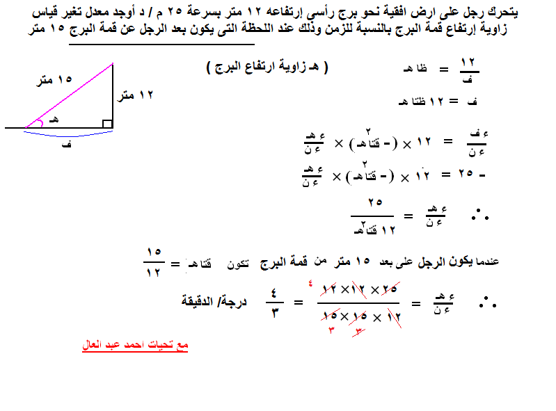 يتحرك رجل على ارض افقية نحو برج رأسى إرتفاعه 12 متر بسرعة 25 م / د أوجد معدل تغير قياس زاوية إرتفاع قمة البرج بالنسبة للزمن وذلك عند اللحظة التى يكون بعد الرجل عن قمة البرج 15 متر .