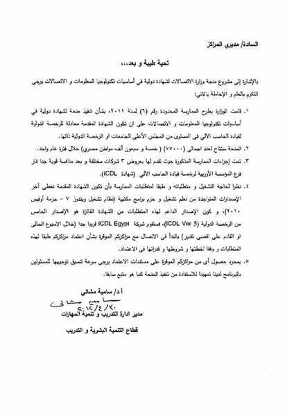 بسم الله الرحمن الرحيم الاخوة الزملاء الفضلاء واضح من ردودكم انكم فاكرين الموضوع تهريج يا جماعة الموضوع بجد لسببين الاول : - لانى انا tester معتمد من المؤسسة الاروبية لقيادة الحاسب الالى وكذلك وزارة الاتصالات وتكنولوجيا المعلومات وأعرف كل الاخبار الجديدة اول باول. الثانى : - انه بالفعل اتبعت للمراكز ميل من الوزارة بالمعنى اللى انا ذكرته ولو مش مصدقين انا هارفع الميل ده لتتاكدوا