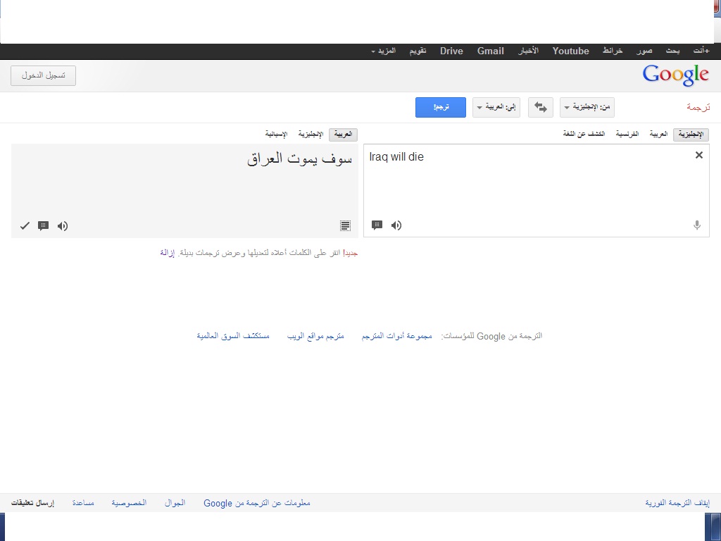 اه بس ايه السر انا لما كتبت مصر و فلسطين و اسرائيل و امريكا ترجم ستموت و لما ترجمت العراق ترجم لن يموت
