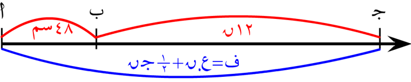عندما تبدأ الكرة الثانية في التحرك، تكون الكرة الأولى قد قطعت المسافة (أ ب) التي قدرها 12 × 4 سم وبفرض أن تتصادم الكرتان بعد مرور ن ثانية من حركة الكرة الثانية .. تكون الكرة الأولى قد قطعت المسافة (ب جـ) وقدرها 12 × ن سم بينما تقطع الكرة الثانية المسافة (أ جـ) في نفس الزمن (ن ث)، بسرعة ابتدائية 4 سم/ث، وعجلة قدرها 2 سم/ث^2 أكمل .... |