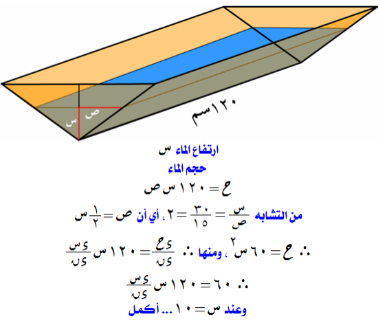 يضخ ماء في حوض فارغ طوله 120سم بمعدل 60سم3/د والمقطع القائم للحوض علي شكل مثلث متساوي الساقين رأسه الي اسفل وارتفاعه يساوي 30سم وطول قاعدته 30سم. اوجد المعدل الذي يرتفع به الماء في الحوض عندما يكون ارتفاع الماء 10سم.