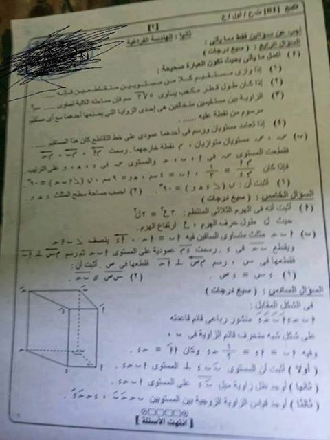 امتحان الجبر والفراغيه واجابات بعض الاسئله