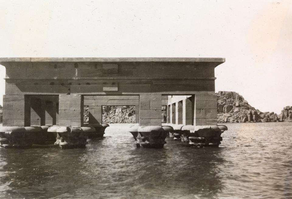 لقطة لجزيرة فيلة في اسوان يظهر فيها كشك تراجان وقد غمرته مياه نهر النيل الي ما قبل قمته بقليل سنة 1932 م