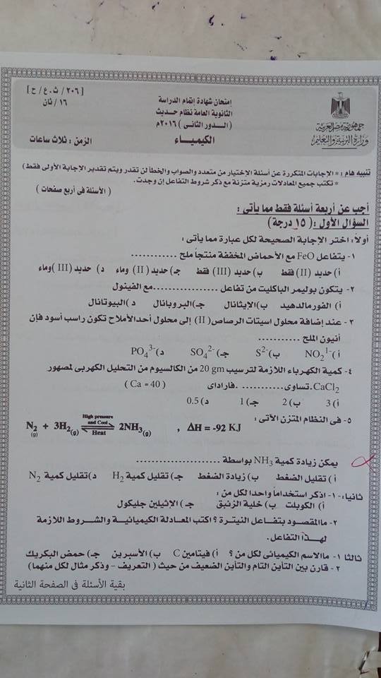 Exll امتحان كمياء لدور الثانى 2016 + الإجابة