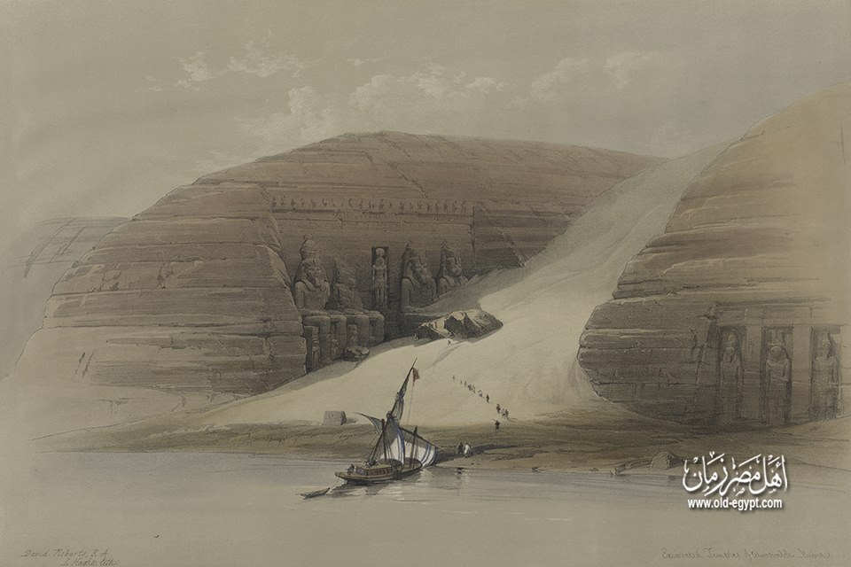 لوحه مرسومة للفنان الاسكتلندي ( دايفيد روبيرت ) يظهر فيها معبد ابو سمبل في اسوان في عهد محمد علي باشا سنة 1838 م وقبل ظهور الكاميرات الفوتوغرافيه بفترة وجيزه . معبد أبوسمبل من المعابد المنحوتة من الجبال في عهد الفرعون رمسيس الثانى كنصب دائم له وللملكة نفرتارى، للاحتفال بذكرى انتصاره في معركة قادش، ولتخويف أهل النوبة المجاورين له، وقد بدأ بناء مجمع المعبد في حوالى ١٢٤٤ قبل الميلاد، واستمر لمدة ٢٠ عاما تقريباً، حتى ١٢٢٤ قبل الميلاد. ومع مرور الوقت كانت الرمال قد غطت تماثيل المعبد الرئيسى حتى الركبتين. وكان المعبد منسياً حتى عام 1813 م ، عندما عثر المستشرق السويسرى يوهان لودڤيگ بوركهارت على كورنيش المعبد الرئيسى. وتحدث بوركهارت عن هذا الاكتشاف مع نظيره الإيطالى المستكشف جيوفاني بلزوني، وسافرا معا إلى الموقع، لكنهما لم يتمكنا من حفر مدخل للمعبد. وعاد بلزوني في عام 1818 م ، بعد نجاحه في دخول المجمع. وقيل إن رجاله حملوا ما يمكن حمله معهم من داخل المعبد . ![]()