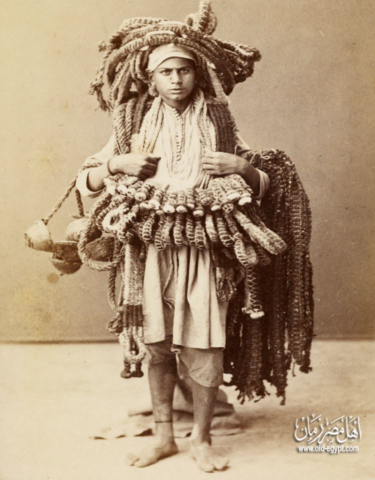 صورة لبائع الحبال حوالي عام 1863 . تلاحظون حضراتكم القدم اليمني للبائع ملفوف عليها خيط رفيع ... هذا الخيط لاحظناه في كل صور اصحاب المهن البسيطة مثل السقايين و العربجية و الباعة الجائلين و اتضح انه يعني عدم تهرب الباعة من ضرائب الميري المفروضه عليهم آنذاك , فبعد الديون المتراكمة التي بدأها سعيد باشا و بلغت حد الخطر في عهد اسماعيل باشا تم فرض هذة الضرائب علي كل اصحاب المهن البسيطة , كان الخديوي اسماعيل قد اضطر لبيع قصوره و ممتلكاته و باع ايضا حصة مصر من قناة السويس و حجزت البنوك الاوروبية علي أملاك الدائرة السنية جزاءا لديونها المتراكمة ذات الفوائد الفلكية فقامت الحكومة بفرض ضرائب مجحفه علي كل شئ , الغذاء و الدواء و القطارات و في النهاية اضطر البسطاء لدفع فاتورة اخطاء اسماعيل باشا رغما عنهم , رغم أنهم بالاساس لم ينعموا بأي من مظاهر البذخ التي انفقت فيها هذة الديون فلم يحصلوا مثلا علي وجبة واحدة أو كسرة خبز كانت تقدم للآلاف من ضيوف الخديوي في حفل افتتاح قناة السويس ! ![]()