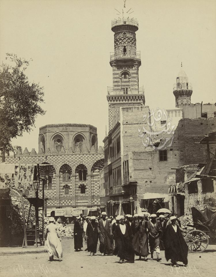 لحظة خروج المصلين من مسجد ومدرسة السلطان قلاوون في القاهرة سنة 1888 م مجموعة السلطان قلاوون بمنطقة بين القصرين، بشارع المعز لدين الله الفاطمي والتي تضم مدرسة وقبة وبيمارستان, وأنشأها السلطان الملك / المنصور سيف الدين قلاوون الملقب أيضا بالألفي . قام بانشائها السلطان المنصور قلاوون الذي يعد من أفضل وأشهر المماليك البحرية وهو السابع من ملوك الترك بمصر، تولى عرش مصر سنة 1276 م بعد أن عُزِل بدر الدين سلامش بن الظاهر بيبرس الذي كان قلاوون يقوم بالوصاية عليه. وهو من مماليك الصالح نجم الدين أيوب، اشتراه بألف دينار، لذا كان يلقب بقلاون الألفي وأخذ يتقلد المناصب العليا حتى ظفر بحكم مصر. تضم المجموعه أعظم بيمارستان وكلية طبية في تاريخ مصر خلال العصور الوسطى، فقد كلف السلطان المملوكي قلاوون العالم والطبيب ابن النفيس بمهمة إنشاء البيمارستان المنصوري سنة 1281 م وعينه رئيساً لهذا البيمارستان، وقد جعل البيمارستان للجندي والأمير والكبير والصغير والحر والعبد والذكور والإناث، ورتب فيه الأطباء والأدوية، وجعل فيه عدداً من الرجال والنساء لخدمة المرضى، وأفراد لكل طائفة من المرضى موضعاً، فقاعة للبرص وقاعة لمرضى الحميات وقاعة لأمراض المعدة. وينقسم إلى قسمين: قسم للرجال وآخر للنساء، وجعل المياه تجري فيه، وأفرد مكاناً لخزن الأدوية، ومكاناً لرئيس الأطباء لإلقاء دروس الطب. ![]()
