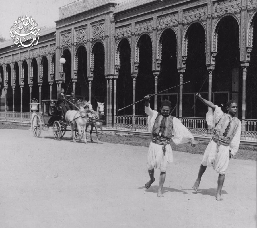 وسع يا جدع أنت و هو وسع و صلي علي النبي صورة لأثنين من الأمشجية يتقدمان عربة أحد الأعيان لحظة وصوله الي فندق الماريوت بالزمالك حوالي عام 1905 . و الامشجي هو السايس الذي يعمل في مهنة رعاية خيل و عربة الباشا و يقوم بحراسة العربة أثناء سيرها في الشوارع بأن يجري الي جوارها أو أمامها و هو ممسك بعصاة صارخا في الناس " وسع يا جدع أنت و هو " ليقوم بتعريفهم بأن هناك شخصا مهما يمر بالطريق كنوع من التعظيم لسيده . ![]()