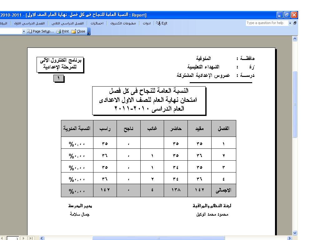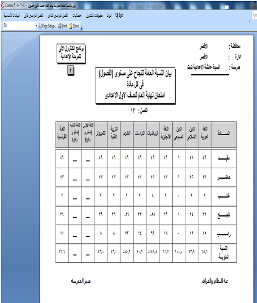 الاخ العزيز جميع مواد الرسوب تظهر فى خانة حالة الطالب ولكن المشكلة ان خانة حالة الطالب او الملاحظات عرضها لا يزيد عن 3 سم وبالتالى فى حالة الطالب المنقطع لا تتسع لتشمل كل المواد حاول تنزيل اخر نسخة للبرنامج وستجد انى اختصرت اسماء المواد لكى تتسع اكتر ولكن المشكلة لا زالت قائمة ولا يوجد لها حل عندى سوى تصغير الخط ولو عندك اقتراح مفيد انا انفذه فوراً من عينيا بالنسبة لنسب النجاح اللى ظاهر عندى اما انك لم ترصد الترم الثانى حتى الان او ان جميع الطلاب راسبين برجاء ارفاق صورة من البرنامج وبها البيانات على الايميل حتى اتمكن من رؤوية العيب بوضوح وعموما سوف اعيد صياغة جميع الاحصائيات ثانية ولكن بعد انتهاء اعمال الامتحانات لانى مشغول جدا جدا وبحاول فى الوقت الحاضر نظراً لضيق الوقت تعديل الحاجات السريعة التى يتوقف عليها عمل البرنامج وياريت لو عندك متسع من الوقت اكتبلى اسماء الاحصائيات التى بها اخطاء مع تحديد شكل الخطاً بالصور كما فعلت حتى اتمكن من التصحيح السريع وشكراً لك شكل نفس الاحصائية من نسخة البرنامج التى عندى ولم يظهر بها هذا العيب |