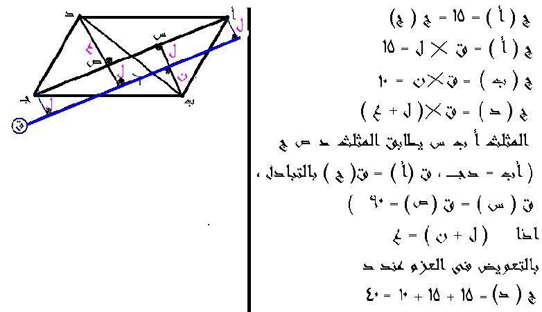 ( ن ) هو طول العمود الساقط من ( ب ) على خط عمل ( ق ) ل هو طول العمود الساقط من ( ا ) = ايضا من ( ج ) على خط عمل ( ق ) خط عمل ( ق ) يوازى ( اج ) |
