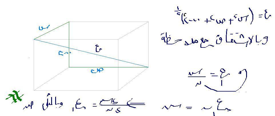 بعد فترة ن = 40 ث و بمعلومية السرعة فان س = 150 × 40 = 6000 م المسافة التى تحركتها السيارة على الارض فى اتجاه الشرق ( عمودى على اتجاه الجنوب ) = ص ص = 75 × 40 = 3000 م لدينا الان مثلث قائم مرسوم على المستوى الافقى ضلعى القائمة معلومان س ، ص نحسب طول الوتر بقاعدة فيثاغورث نفرض ان طول هذا الوتر = ل ( على المستوى الافقى) ل^ 2 = جذر( س ^2 + ص ^2 ) ل = 3000 جذر 5 الان لدينا مثلث قائم على مستوى رأسى ضلعى القائمة هما ل ،2000 ( ارتفاع الطائرة) و منهما نحسب طول وتر المثلث و هو المسافة بين الطائرة و السيارة بعد مرور زمن 40 ث و لتكن المسافة = ف ف^2 = 2000^2 + س ^2 + ص ^2 ----------- > (1) ف = 7000 باجراء الاشتقاق للدالة رقم 1 2 ف دف/ دن = 2 س دس / دن + 2ص دص/دن دف/دن تمثل معدل تباعد الطائرة عن السيارة و هو المجهول المطلوب حسابه دس/دن معلومة وتمثل سرعة الطائرة دص/دن معلومة و تمثل سرعة السيارة بالتعويض دف/دن = 1125/7 م/ث