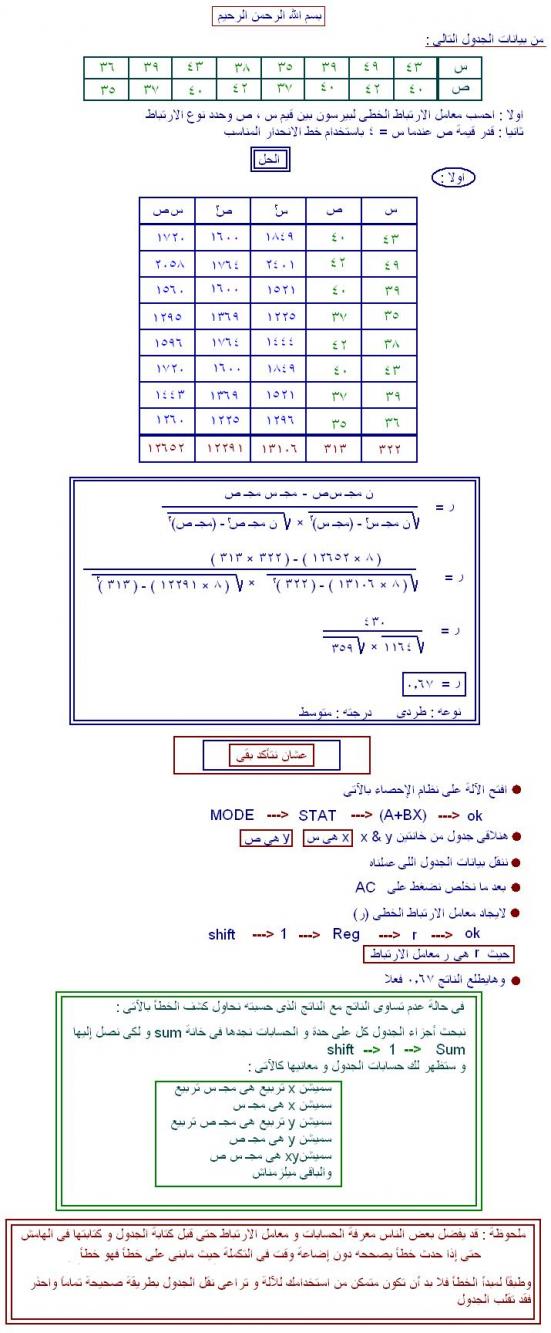 و (لاحظ ليس هناك معامل ارتباط سبيرمان فى الآلة الحاسبة)