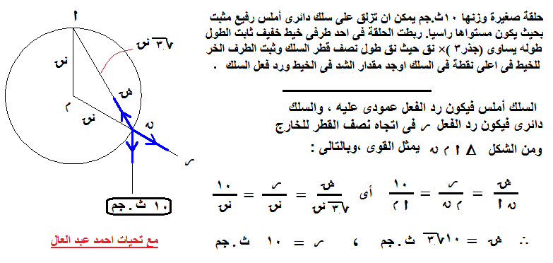 (1) حلقة صغيرة وزنها 10ث.جم يمكن ان تزلق على سلك دائرى أملس رفيع مثبت بحيث يكون مستواها راسيا. ربطت الحلقة فى احد طرفى خيط خفيف ثابت الطول طوله يساوى (جذر3 )× نق حيث نق طول نصف قطر السلك وثبت الطرف الخر للخيط فى اعلى نقطة فى السلك اوجد مقدار الشد فى الخيط ورد فعل السلك .
