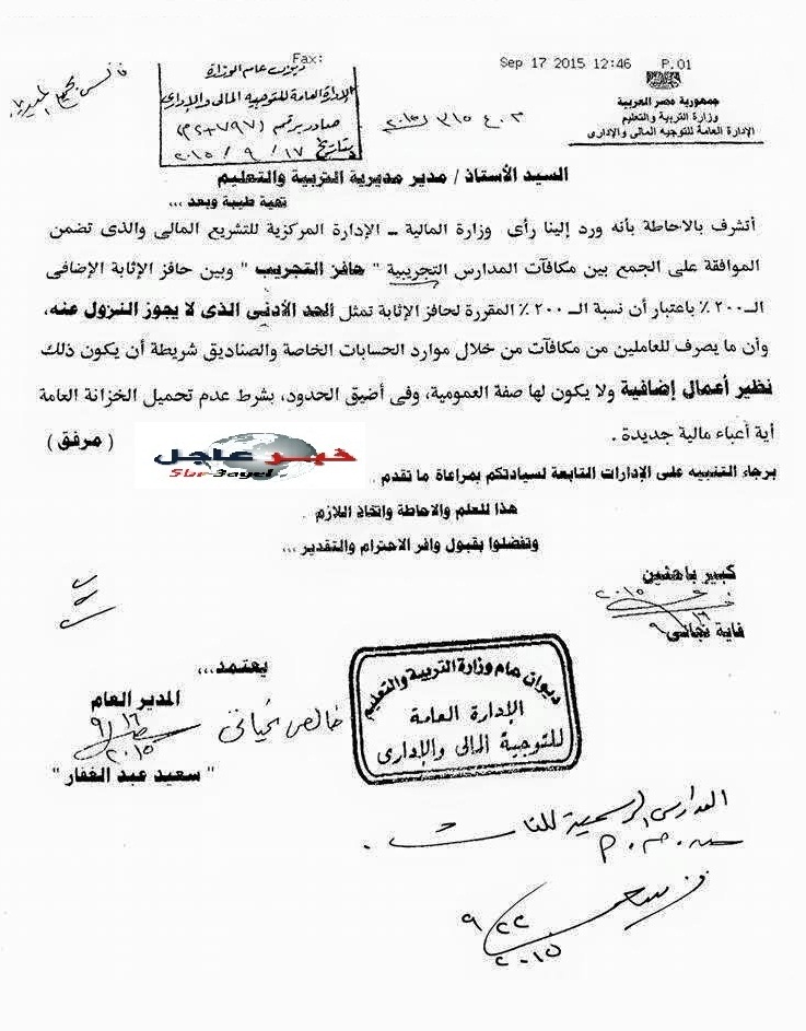![]() التعليم - موافقة وزارة المالية على الجمع بين " حافز التجريب وحافز الاثابة " لجميع العاملين ![]() ارسلت الادارة العامة للتوجيه المالى والادارى فاكسا للمديريات التعليمية يفيد الموافقة على الجمع بين مكافآت المدارس التجريبية " حافز التجريب " وبين حافز الاثابة الاضافى 200 % ، وذلك باعتبار أن نسبة ال 200 % المقررة لحافز الاثابة تمثل الحد الادنى الذى لايجوز النزول عنه وأن مايصرف للعاملين من مكافأت من خلال موارد الحسابات الخاصة والصناديق شريطة أن يكون ذلك نظير اعمال اضافية ولايكون لها صفة العمومية وفى اضيق الحدود وبشرط عدم تحميل الخزانة العامة اى اعباء مالية جديدة . |