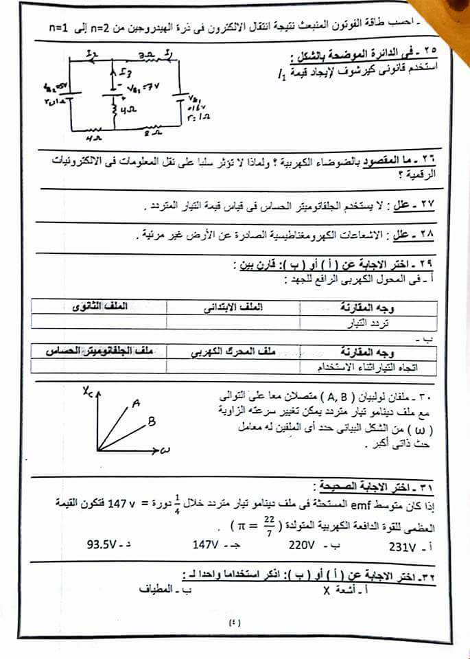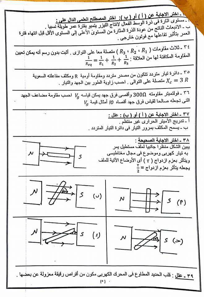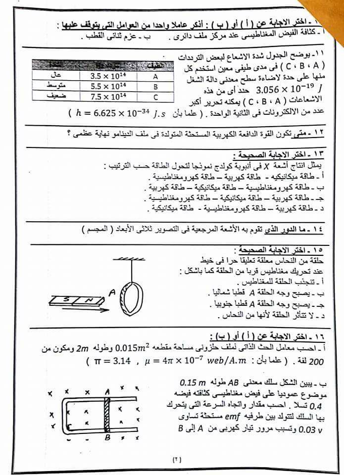 بعض اسئلة امتحان الفيزياء الدور الثاني