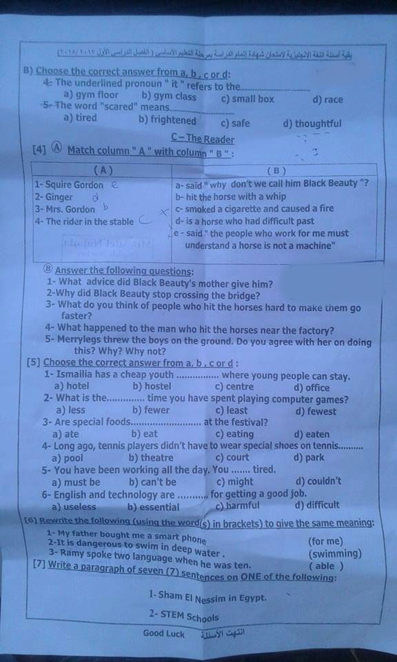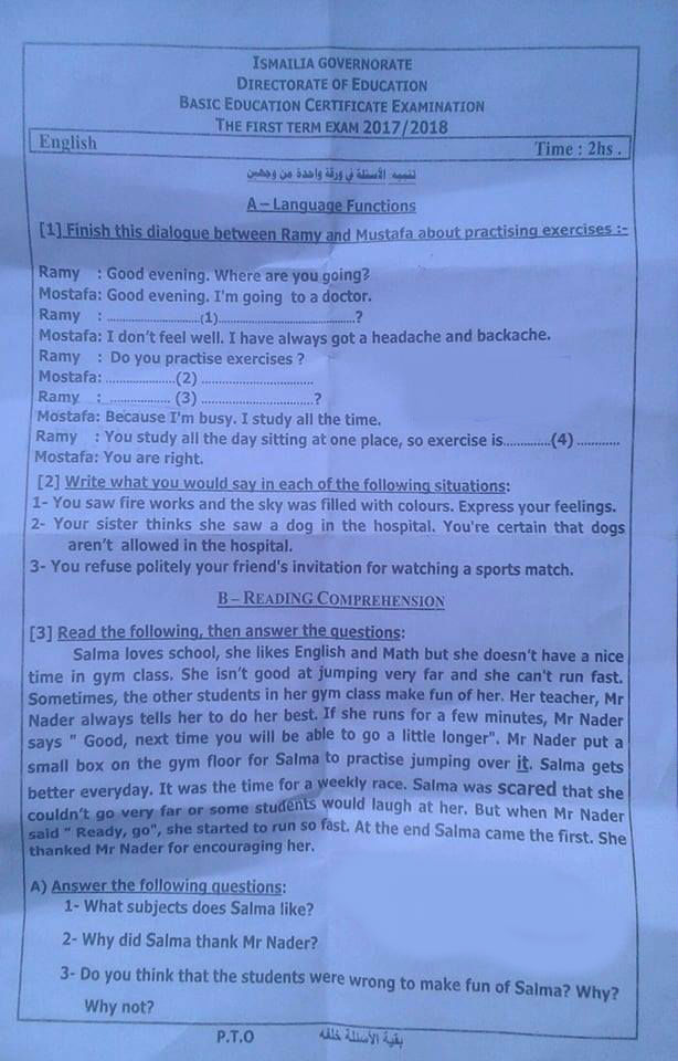 امتحان محافظة الاسماعيلية يناير 2018 لغة انجليزية